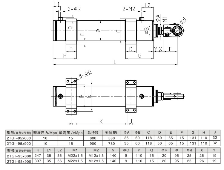 二級伸縮液壓缸 腳座鏈接外形安裝尺寸圖