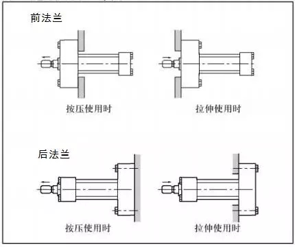 一般安裝方式如下: ?。?)法蘭安裝適合于液壓缸工作過(guò)程中固定式安裝,其作用力與支承中心處于同一軸線的工況;其安裝方式選擇位置有端部、中部或尾部三種,如何選擇取決作用于負(fù)載的主要作用力對(duì)活塞桿造成壓縮(推)應(yīng)力、還是拉伸(拉)應(yīng)力,一般壓縮(推)應(yīng)力采用尾部、中部法蘭安裝,拉伸(拉)應(yīng)力采用端部、中部法蘭安裝,確定采用端部、中部或尾部法蘭安裝需同時(shí)結(jié)合系統(tǒng)總體結(jié)構(gòu)設(shè)計(jì)要求和長(zhǎng)行程壓縮(推)力工況的液壓缸彎曲穩(wěn)定性確定。